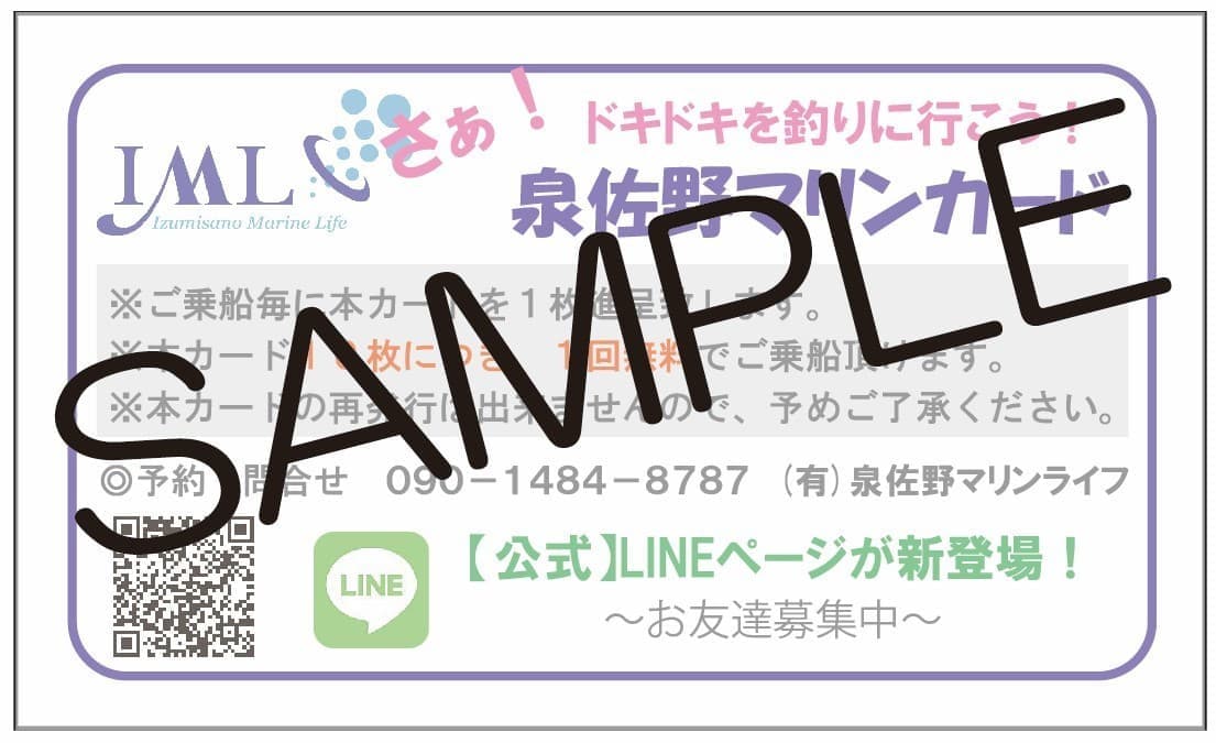 「泉佐野マリンカード」発行中。ご乗船毎に1枚進呈。 10枚集めると1回無料(6時間プラン)でご乗船頂けます。※どなた様でもご利用できます。※仁王丸・宝来丸・黒潮丸・青龍丸の各船共通サービス券。※6時間・9時間の釣りプランのみお渡し。